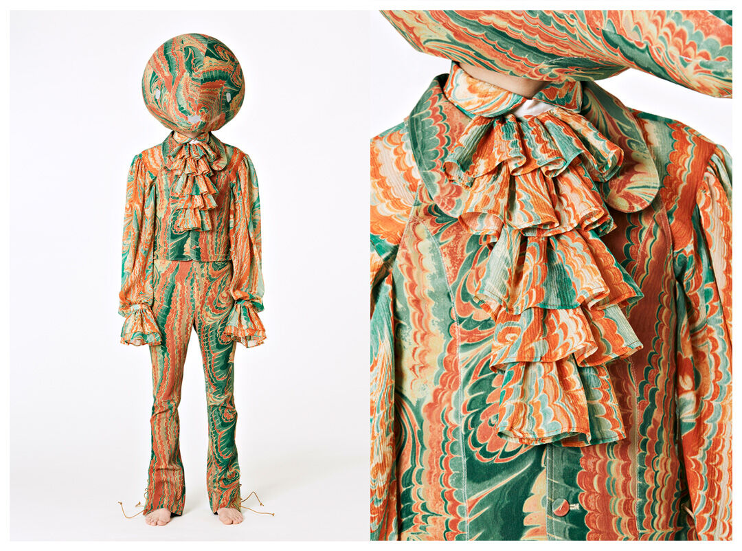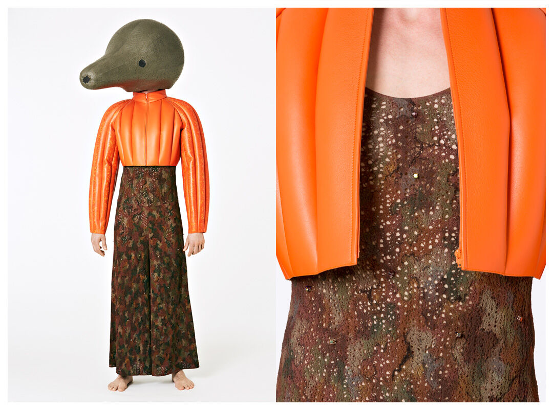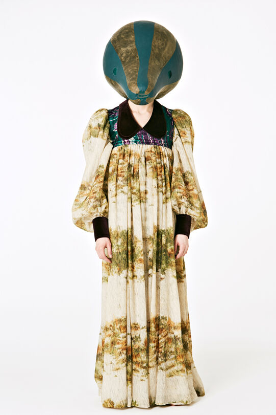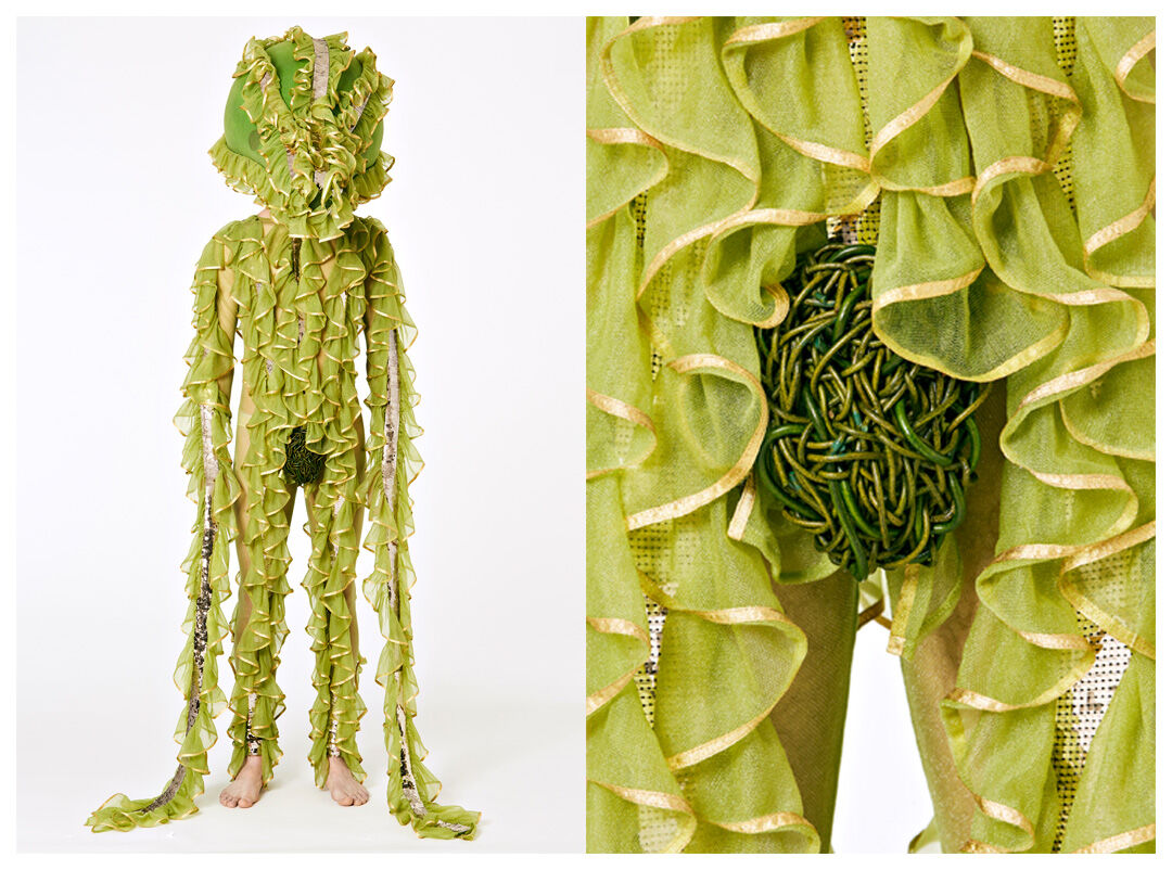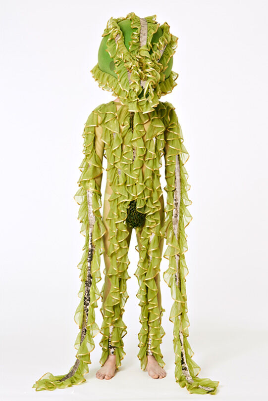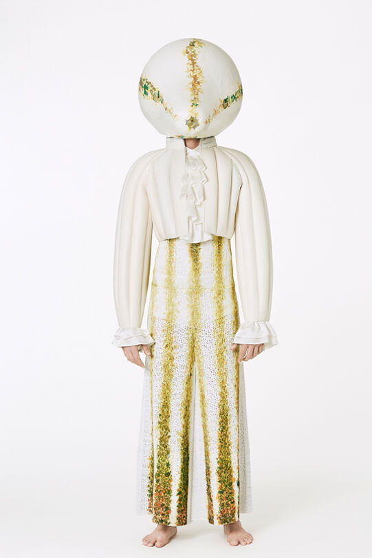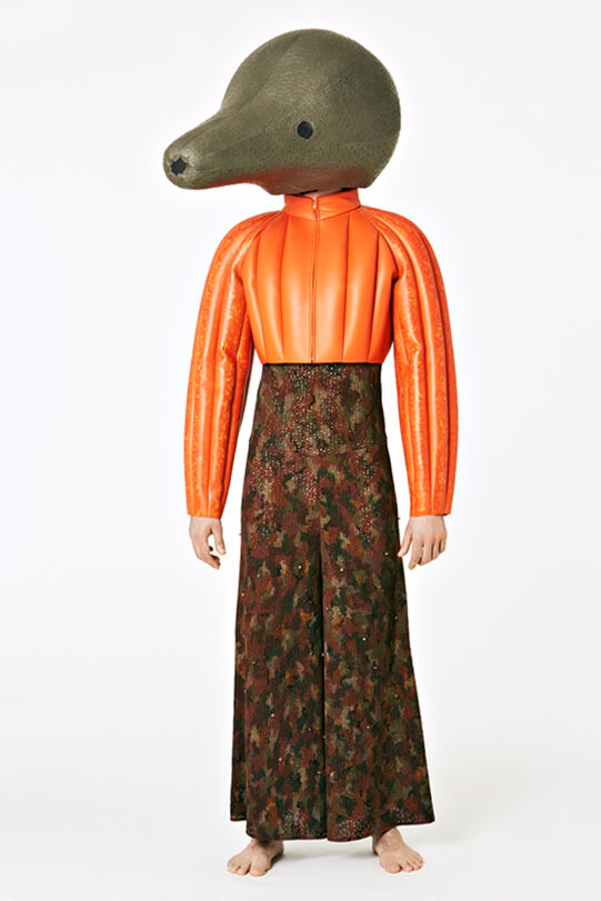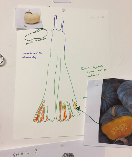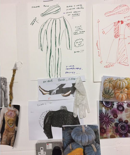 Hamilton has designed seven costumes in collaboration with LOEWE Creative Director Jonathan Anderson that incorporate the colours and shapes of varieties of squash or pumpkin. The squash inspired the organic textures of the costumes and heads, that range from hand painted leather to printed silk crepon, while 1970s clothing references shaped some of the silhouettes. Performers will select a costume each day, informing and reflecting their individual presentation of the character as they inhabit the space.