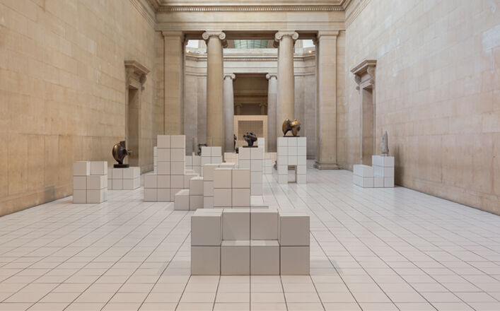 Anthea Hamilton has transformed the heart of Tate Britain into an elaborate stage for the continuous 6-month performance of a single character, dressed in a colourful squash-like costume. Over 7,000 white floor tiles have been laid to span the length of the Duveens and encase a series of large structures that serve as podiums for a number works of art from Tate’s collection, chosen by Hamilton for their organic forms and colours. The tiles create an immersive new environment within the neoclassical galleries.