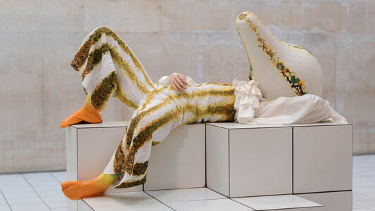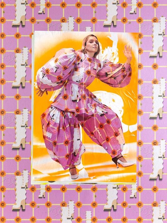 Anthea Hamilton ist eine britische Künstlerin, die für ihren surrealen Intellektualismus und ihre verspielten, großflächigen Installationen bekannt ist. Für die Show-on-the-Wall von FS21 entwarf Hamilton ein blumiges Tapetendesign, das auch als Print auf den wichtigsten Konfektionsstücken der Kollektion zu sehen war.
