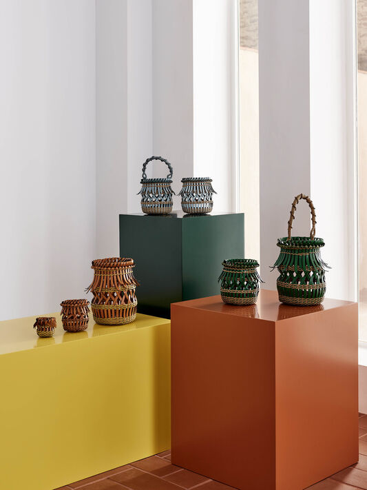 Die Fringes Reihe, die den Geist der handgefertigten Ästhetik von Ken Price widerspiegelt, besticht mit fein geflochtenen Lederkörben und wird zusammen mit der Capsule Collection eingeführt.