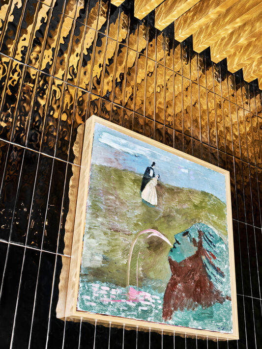 Artisanal ceramic walls in silver, aubergine and green merge with grounding surfaces in concrete marmorino and colourful wool carpets.