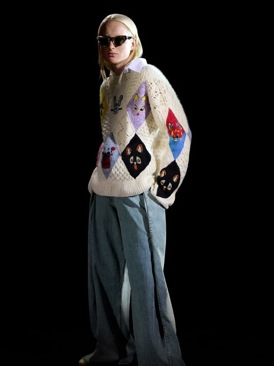Mischievous felines add a quirky touch to ready-to-wear and accessories, including handcrafted knitwear and Toy heels featuring sweet cat charms.