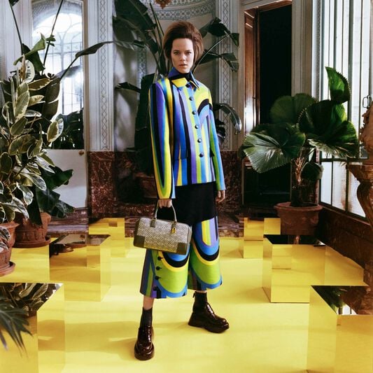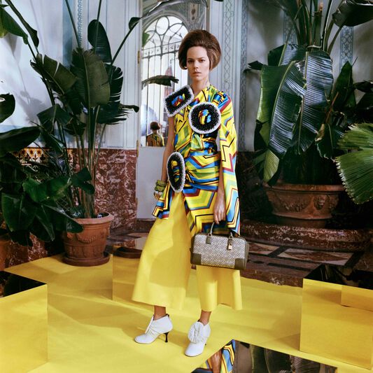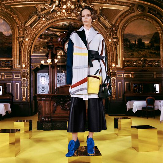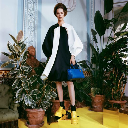 A collection that conveys the sheer joy and electricity of fashion-making: the idea of dressing up as an audacious act. A palette of acrylic hues explodes on abstract silhouettes.