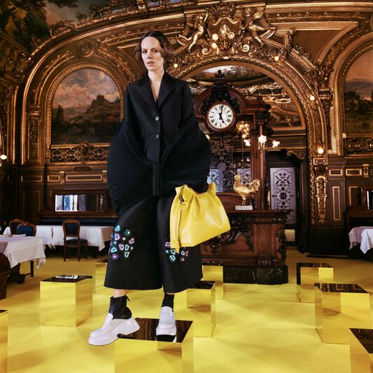 figures such as Charles Dickens and Alexandre Dumas. Today, Ms Steel is the world’s best-selling living author, with 800 million copies of her 180 books sold. Her latest work, neither directly referenced by nor referential to Jonathan Anderson or LOEWE, takes place in the fashion industry, its heroine the editor of a fictional fashion publication. That this plot needs no further explanation is an example of fashion’s pop-culture currency: documentaries and feature fi lms have, over the past decade, broadened public perceptions of what was previously considered a niche interest. Fashion has been democratised, in the modern world, because its images can be consumed by all - it is both a part of culture and, in itself, pop culture. Often showcased online, or via social media, those images however can be fleeting. Conversely, there is a tangibility to a news-paper, giving the fantasy of fashion a physical presence. You grip a newspaper, you turn the pages. Here, you see a show in the news—a fantasy. Hopefully, it will make you dream.