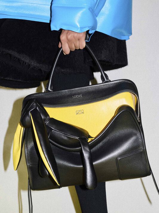 Proportions généreuses et nœuds métalliques façon bijou, inspirés d’un modèle des archives LOEWE.