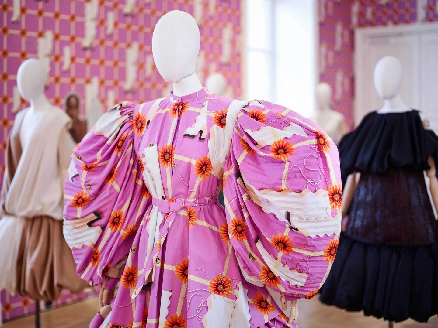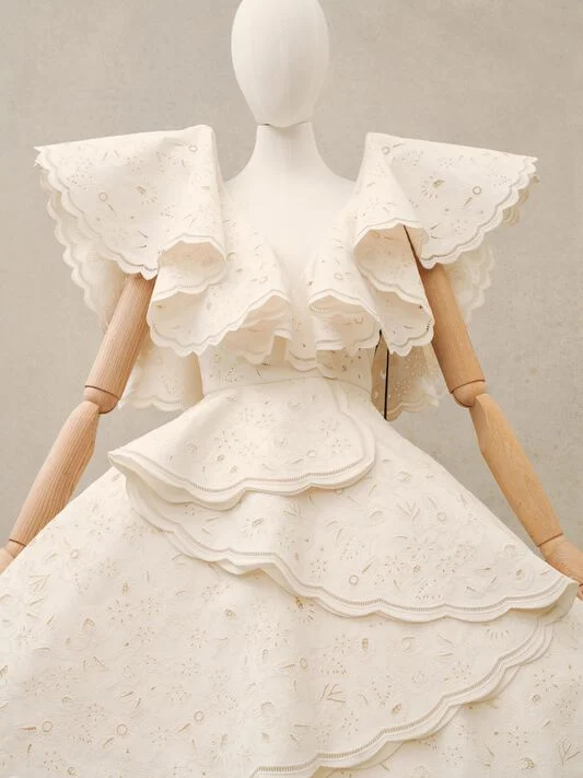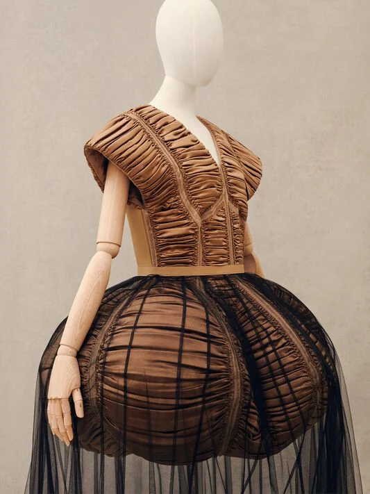 Patte a spirale. Maniche e gonne a palloncino. Crinoline. Orli a fazzoletto. Cerchi. Nodi giganti. Rotondità che diventano sempre più grandi. Un senso di allungamento. La sartorialità immacolata fa da contraltare a prodezze da avanspettacolo.