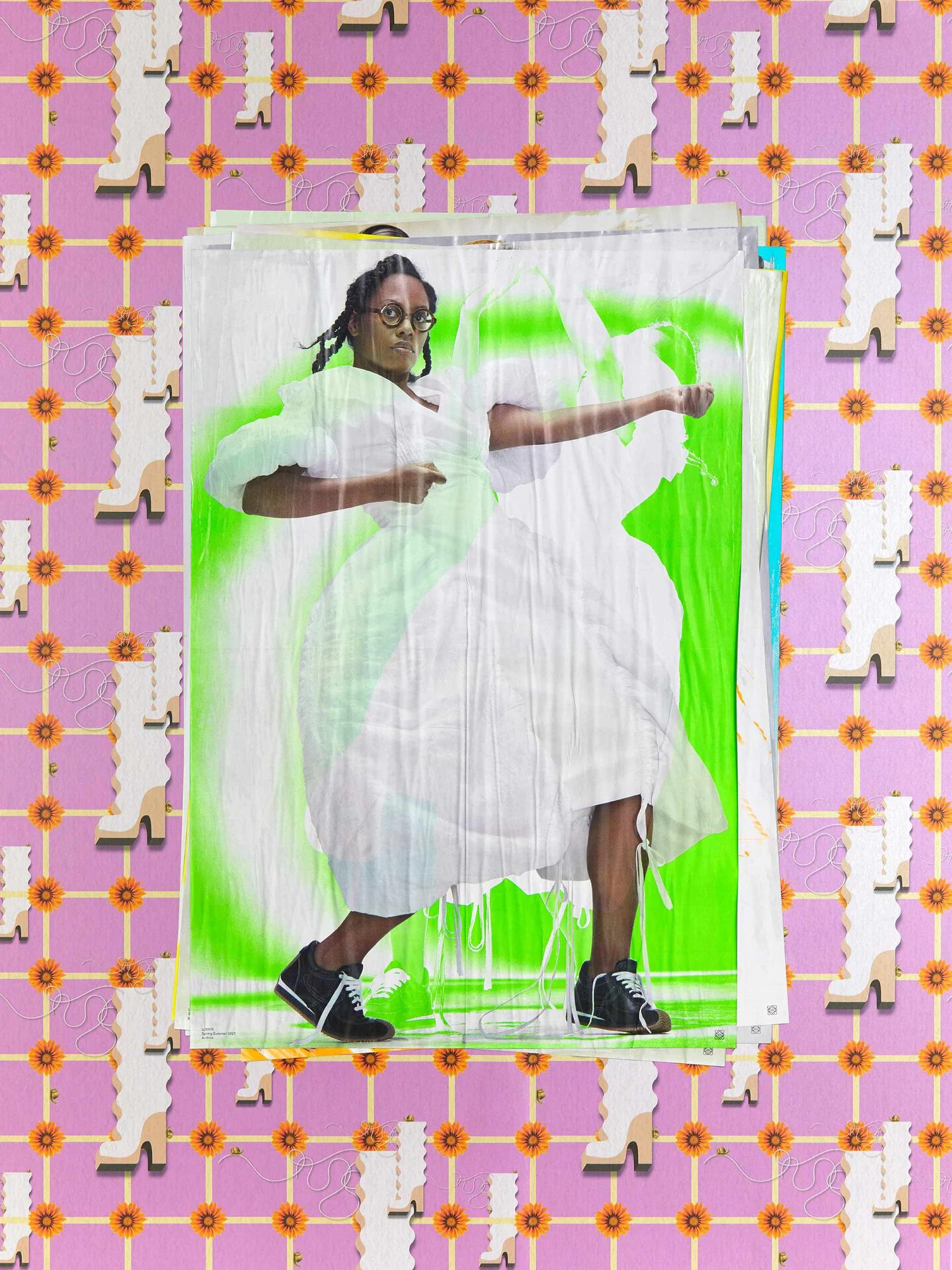 'Sr Jeanne Wavy Boots w. Gazanias and Snails" (2020) è una carta da parati dell'artista Anthea Hamilton creata per lo Show-on-the-Wall LOEWE PE21, che funge da opera d'arte centrale della mostra.