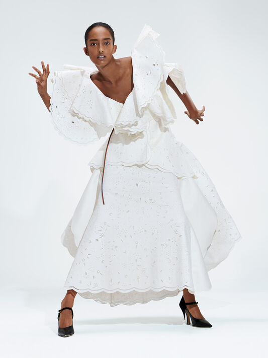 Estremizzazione scultorea della moda, esaltata in tutta la sua teatralità, la collezione Donna PE21 è descritta da Jonathan Anderson come una storia di silhouette drammatiche che esplorano l'arte della modellistica.