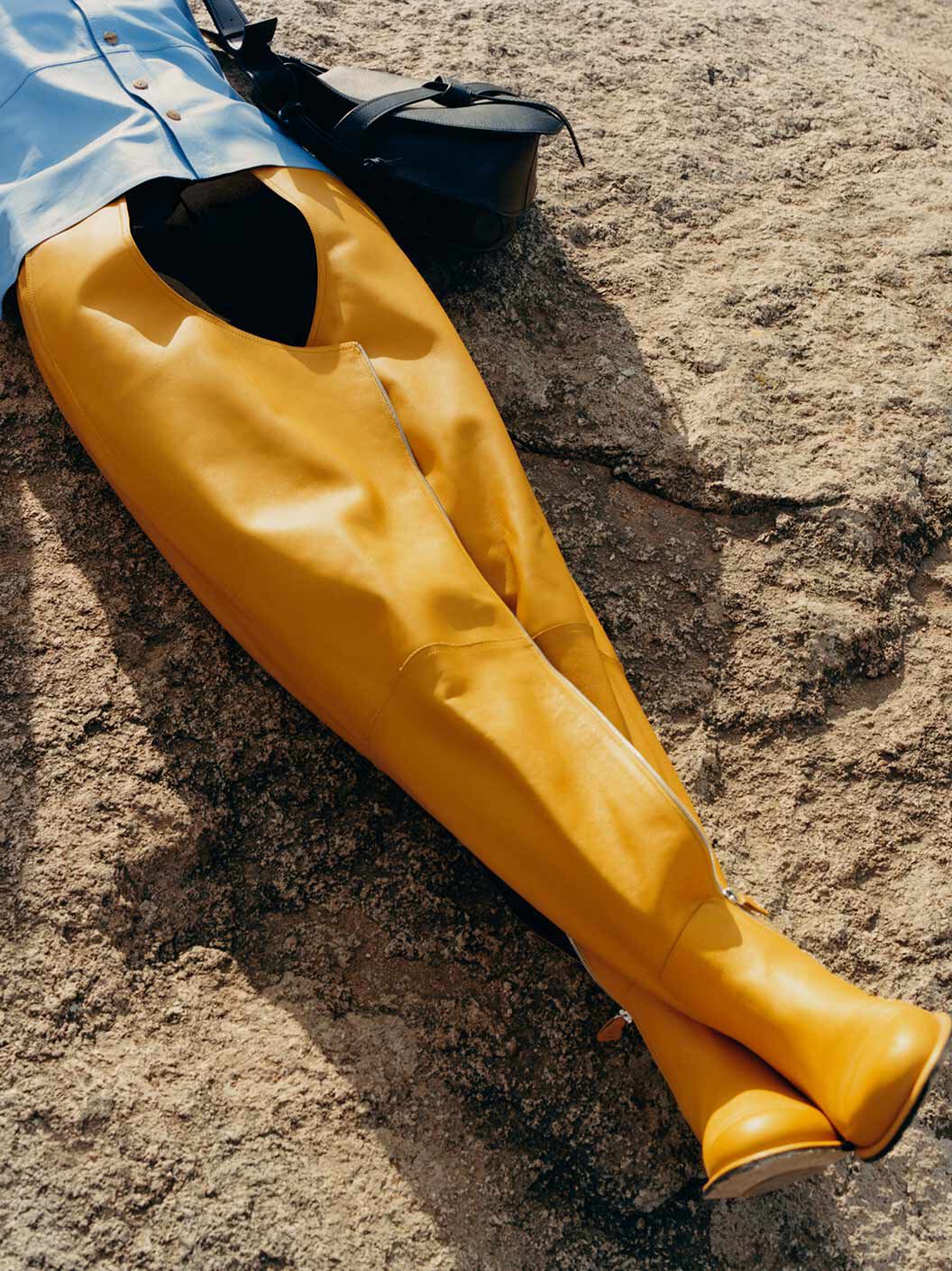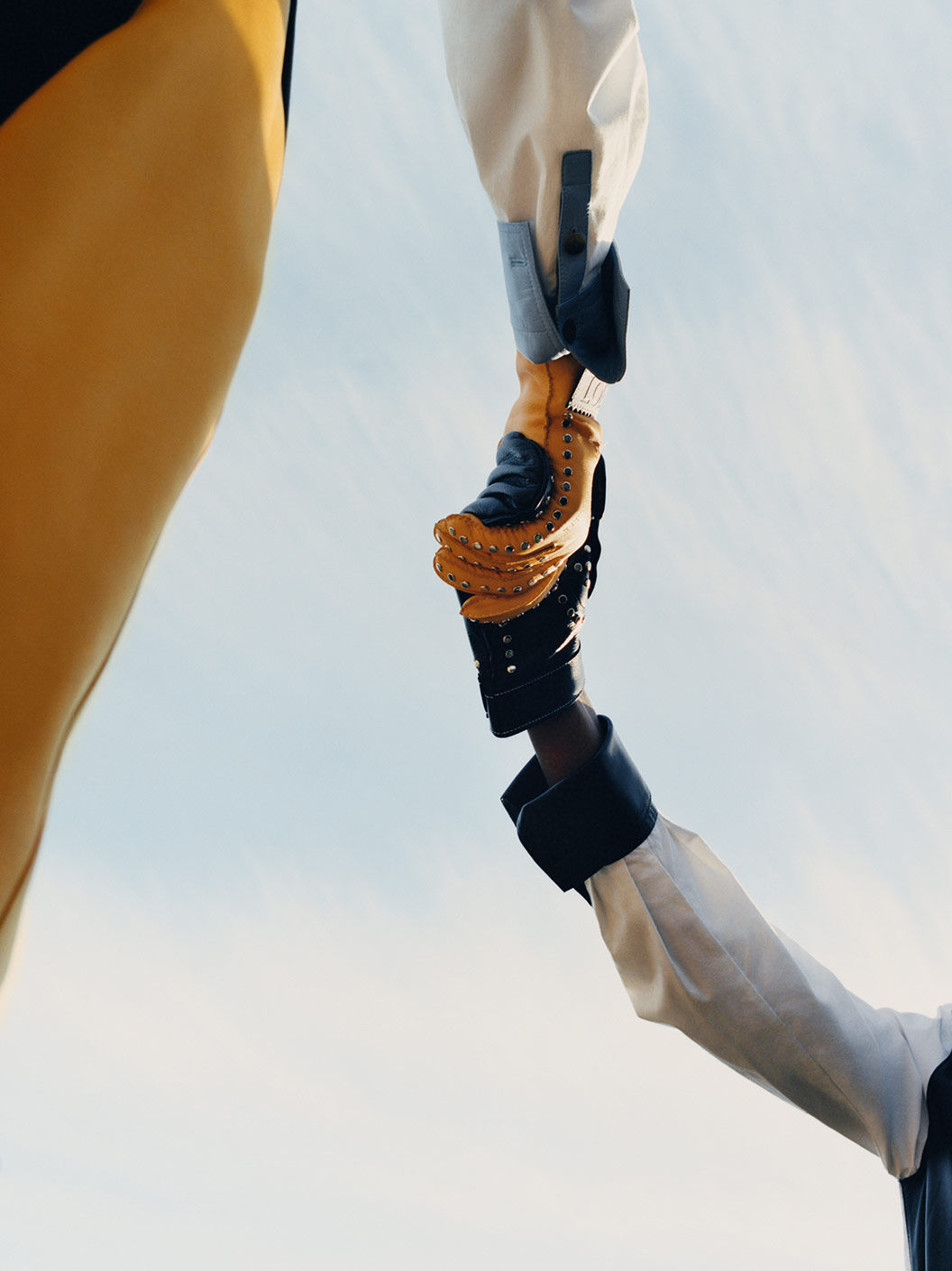 Adding new dimensions to the scenes, strange inflatable white and yellow shapes with abstract volumes sharply offset the stone textures of the natural and man-made backdrops, whilst creating a bold visual link to the silhouettes and colours featured in the collection.