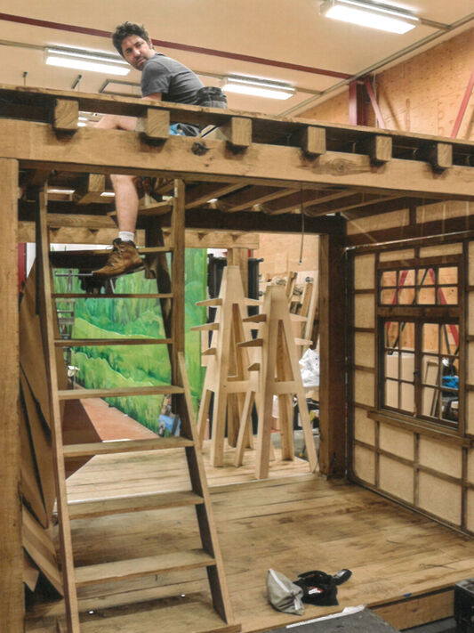 Al igual que en la película, la artesanía está en el centro de la producción escénica. "Me fijé en la construcción de las casas japonesas y me inspiré en la importancia de los elementos naturales, como la madera y el papel. Combiné estos elementos con las habilidades que he adquirido a partir de la escenografía europea, además de la artesanía japonesa, como el Shou Sugi Ban. Por ejemplo, no quería que la casa pareciera un decorado pintado. En lugar de eso, compramos roble francés bonito e hicimos un revestimiento muy fino para que la casa pareciera de madera auténtica y maciza. Gran parte de mi trabajo se basa en la idea de la calidad del material. Me gusta que cuando el público entra en el teatro no sepa cómo va a ser la producción y la escenografía".