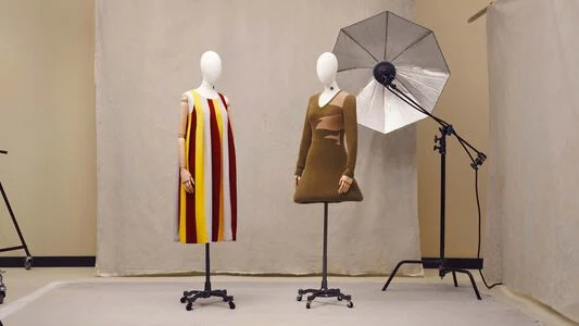 로에베 2021 봄/여름 프리컬렉션은 마네킹 위에서 실루엣의 형태를 잡기 위해 작업된 개더링, 폴딩, 타이, 와이어, 랩, 드레이프 디테일로 가득합니다.