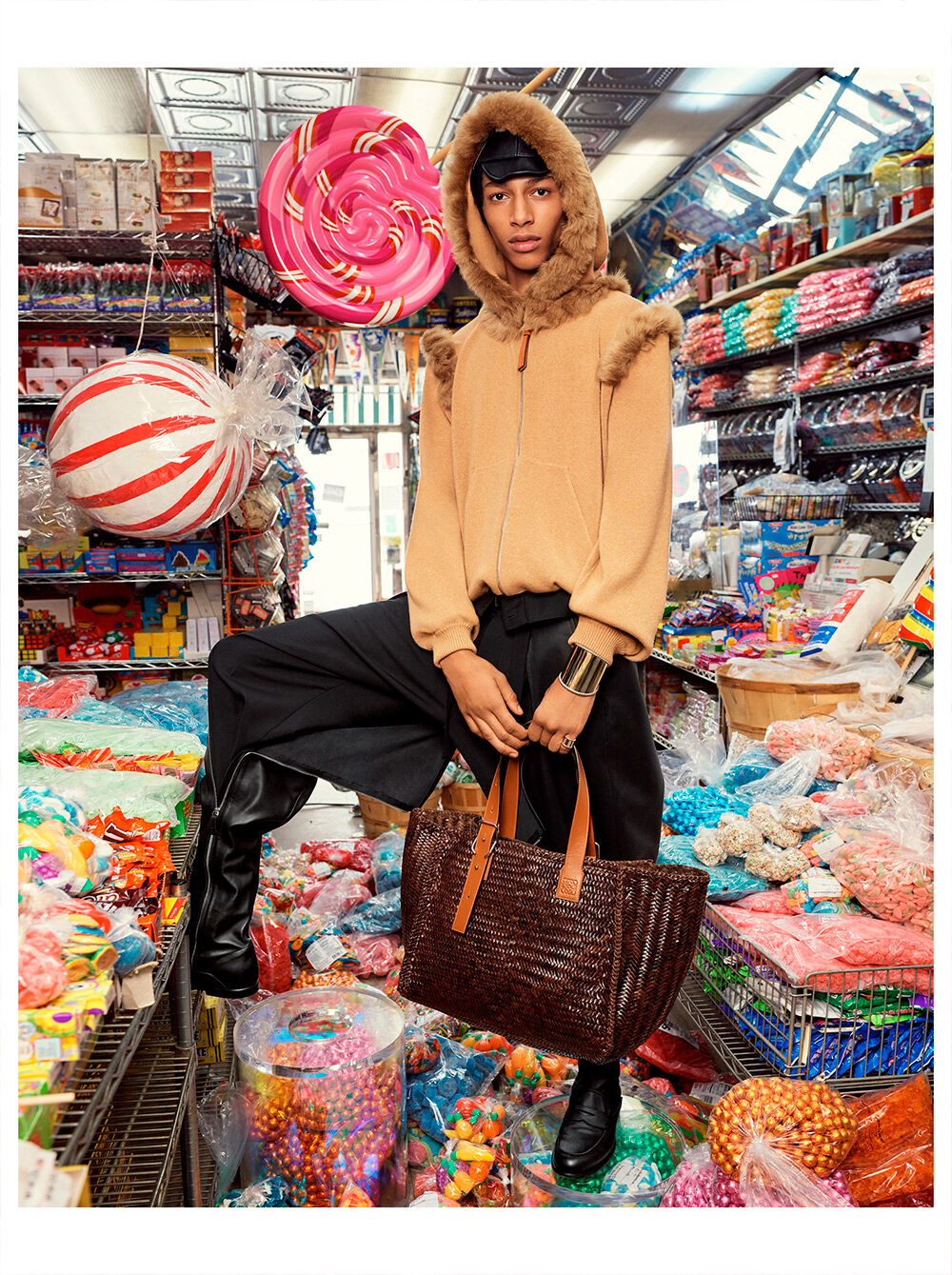 形象大片的时尚照片取景于一家摆满糖果的杂货铺内。大片中,模特Yassine Jaajoui身穿一件连帽毛衣,与背景中的巨型薄荷糖和圆形糖果形成鲜明对比。