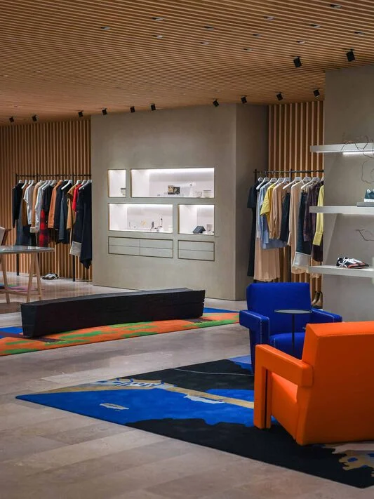 这间精品店占地340平方米,宽敞而私密的空间内展出丰富的男士及女士成衣、手袋,以及围巾和鞋履等配饰,雕塑、手工艺品及设计作品相得益彰。