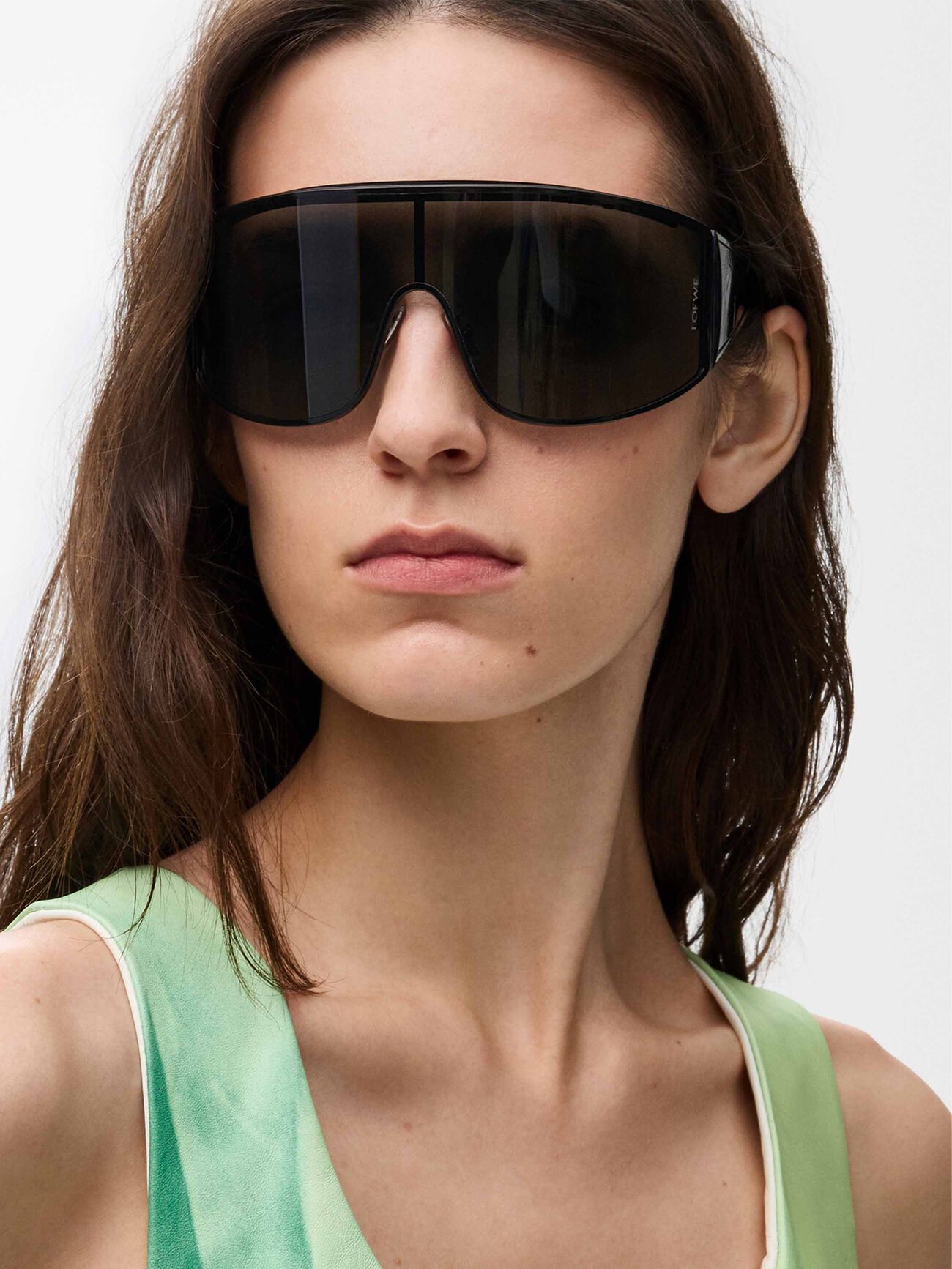 全新太阳眼镜展现未来主义廓形和创新弧形镜腿设计,搭配烟熏色或镜面镜片,彰显前卫造型。