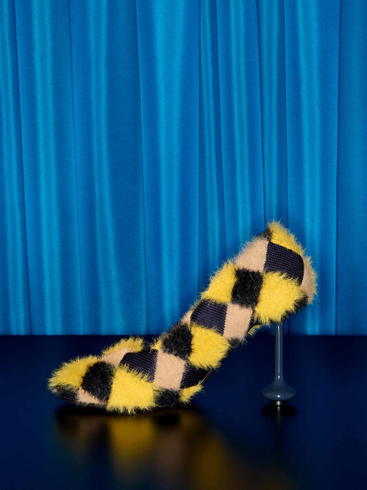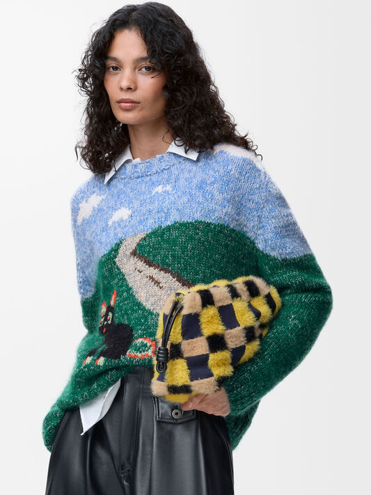 インターシャ、刺繍、プリント、トロンプルイユなどの技法を用いて精巧にクラフトされた猫たちがシグネチャーバッグ、革小物、アクセサリーを飾ります。ルイス・ウェインの未来的な猫の陶芸作品は、遊び心あふれるクラッチバッグとして立体的に再想像されます。