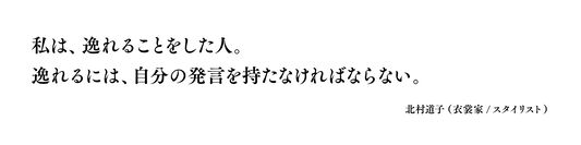 “私が働き始めた頃は、200人近く男社会。私は、その中で逸れることをした人。” 強い眼差しとともに、北村道子は語ります。映画・広告界に数々の軌跡を残し、72歳となった今も現役で活躍する孤高の衣裳家、北村道子。本キャンペーンでは主人公の一人であると共に、スタイリングも務めました。