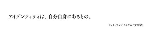 "アイデンティティは、自分自身の中にあるもの。" バングラディッシュにルーツを持ち、10歳から日本で育ったシャラ・ラジマには独特の"東京"らしさが漂います。"no identity"なルックスを自ら生み出し、活躍するコンセプチュアルなモデル。シャラは、二元論を超えた在り方を私達に提示します。