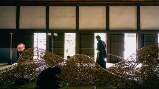 竹という素材の持つ個性をテーマにしたその作品は、シンプルでありながら複雑な美意識を体現します。完成した作品は展覧会が終わると同時に解き、その素材の90%ほどを繰り返し使用することで、竹の強さを称えながら継続的な創造のサイクルを生み出しています。