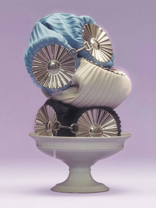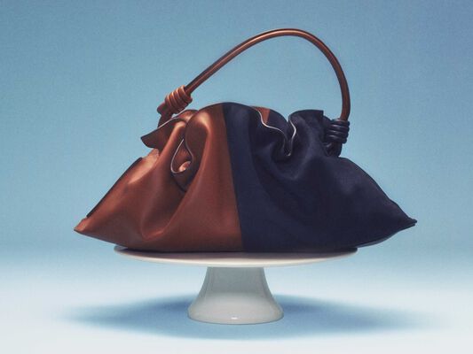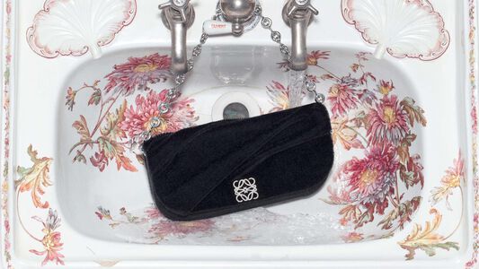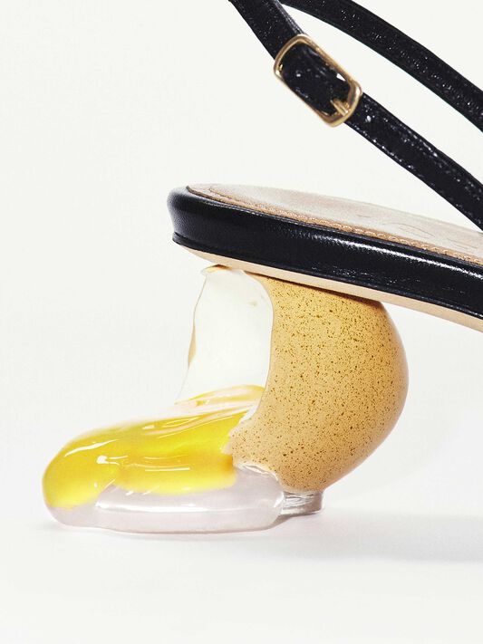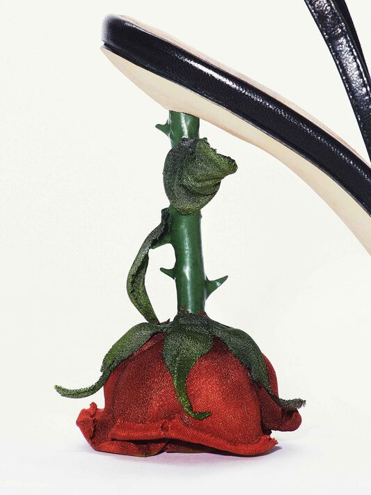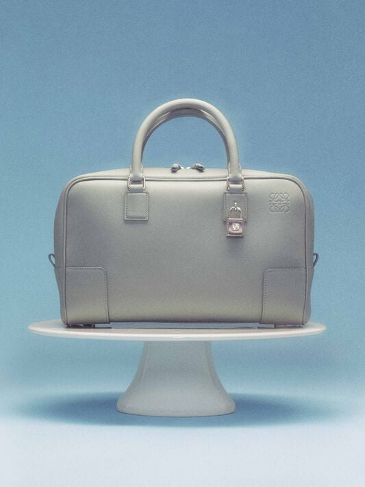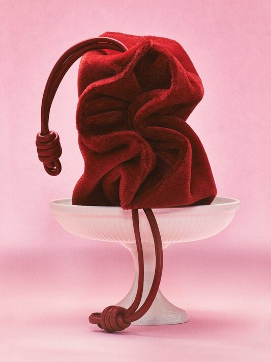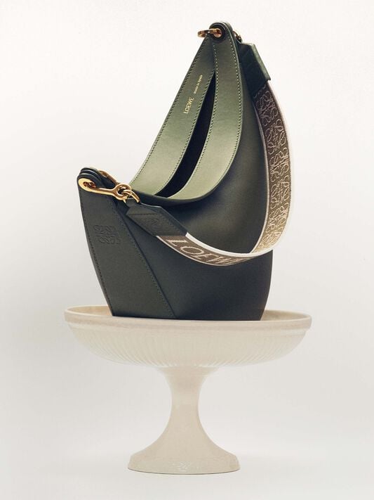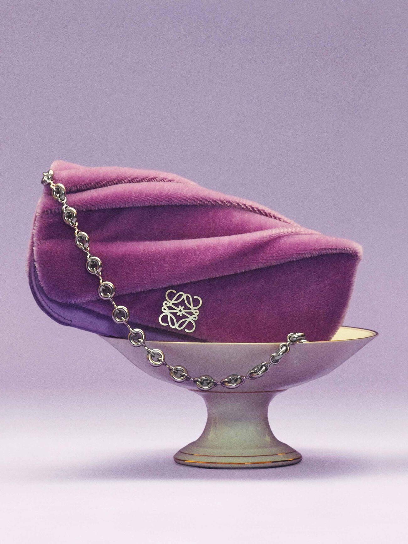 El clásico bolso Goya en piel sedosa. El bolso Goya clutch alargado y el bolso Flamenco en terciopelo. Una nueva forma, el curvilíneo bolso LOEWE Luna, en piel lisa y jacquard Anagrama. Salones y sandalias con tacones fantasía Ready-made que juegan con el concepto de la fragilidad: una rosa, una pastilla de jabón, un huevo. Esculturales tocados.